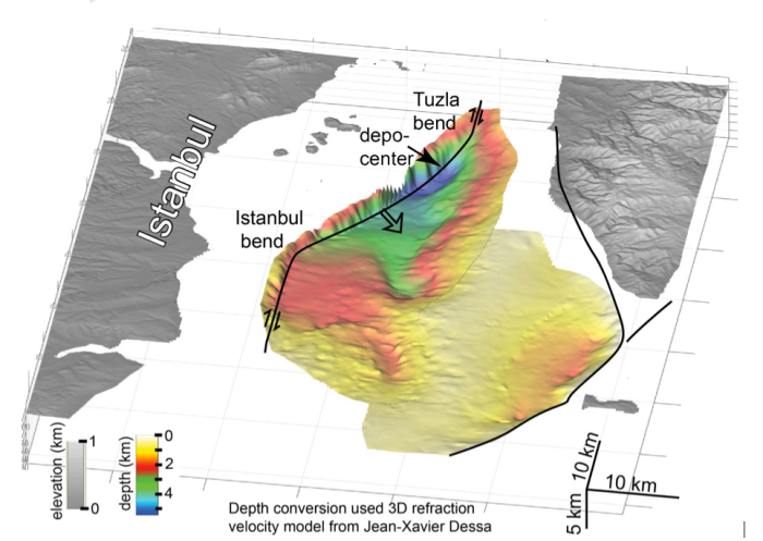 Acoustic data that image below the sea floor (“seismic reflection data”) show a stack of glacial period deltas beneath Marmara Sea, Turkey, south of Istanbul. These deltas formed the basis for a stratigraphic age model for the last half million years. More than 100 seismic reflection profiles were used to create three-dimensional surfaces of 5 stratigraphic horizons. A 3D oblique view down and to the east of the ~540,000 year “Green” horizon is shown above. The northern branch of the North Anatolian fault accommodates stretching west of the Tuzla bend, leading to subsidence of 7-10 mm/yr. in the labeled depocenter. Depocenters for older intervals are located successively west of those for younger intervals, consistent with this fault having right-lateral slip. Motion of the east edges of the depocenters relative to the north side of the fault is about 18 or 19 mm/yr.