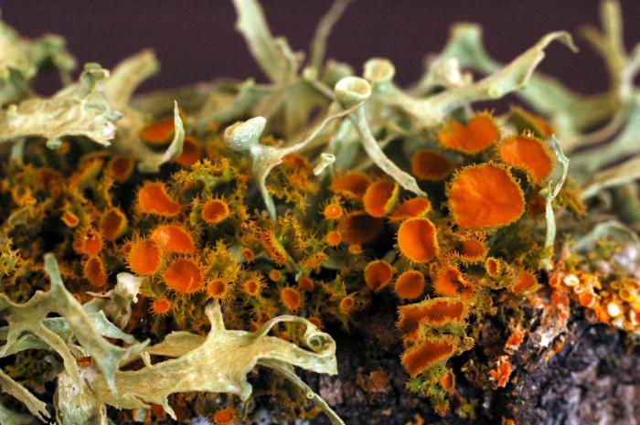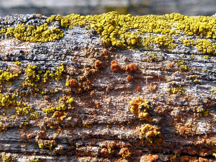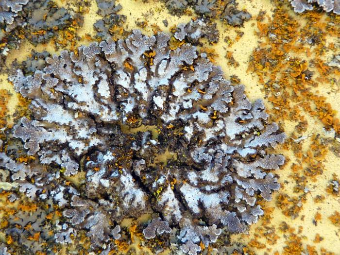 This species is the most common Physconia at Sedgwick. Lobes are rounded and partly overlapping, somewhat concave, and closely appressed to the substrate. The upper surface is gray to brown, and often white-pruinose, and the lower side pale tan at the edge but darker inward. This species is highly variable in appearance, depending on whether it is in sun or shade. Soredia are abundant, often as continuous marginal bands and in laminal patches toward the center. Few apothecia are seen. Another species, Physconia enteroxantha, is also similar, except for its yellowish medulla (inner tissue), visible at cracks or cuts. The thallus in the photograph was growing on metal of an abandoned farm machine, surrounded by small thalli of a Xanthoria.