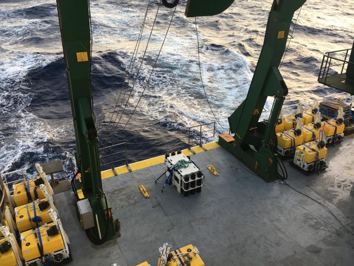As dawn breaks over the central Pacific ocean, we prepare to deploy a rosette containing 31 acoustic communication units (black cylinders). We will lower this rosette to a depth of 3.5 miles beneath the waves before testing to make sure that each one of the communication units works. These units will be installed on the ocean bottom seismometers (seen here stored on the back deck) and will allow the ship to communicate with these sensitive instruments as they detect remote earthquakes once they have been deployed on the seafloor.